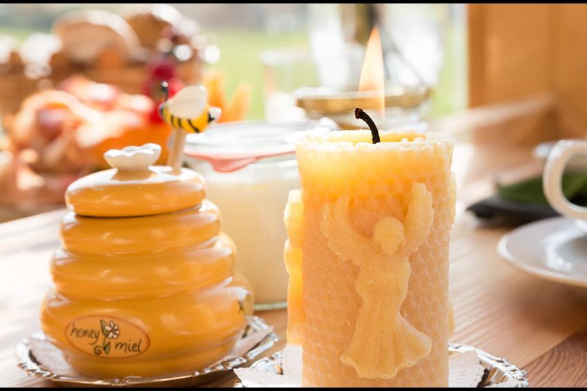 frische Kuhmilch gibt es 2 x täglich, hausgemachtes Joghurt, selbst gemacht Marmelade (15 verschiedene Sorten) und Honig, frische Eier von unseren frei lebenden Hühnern, hausgemachte Säfte, z.B. frischer Apfelsaft (je nach Saison ), Tee aus unserem Kräutergarten, ab und zu gibt es frischen, hausgemachten Käse.